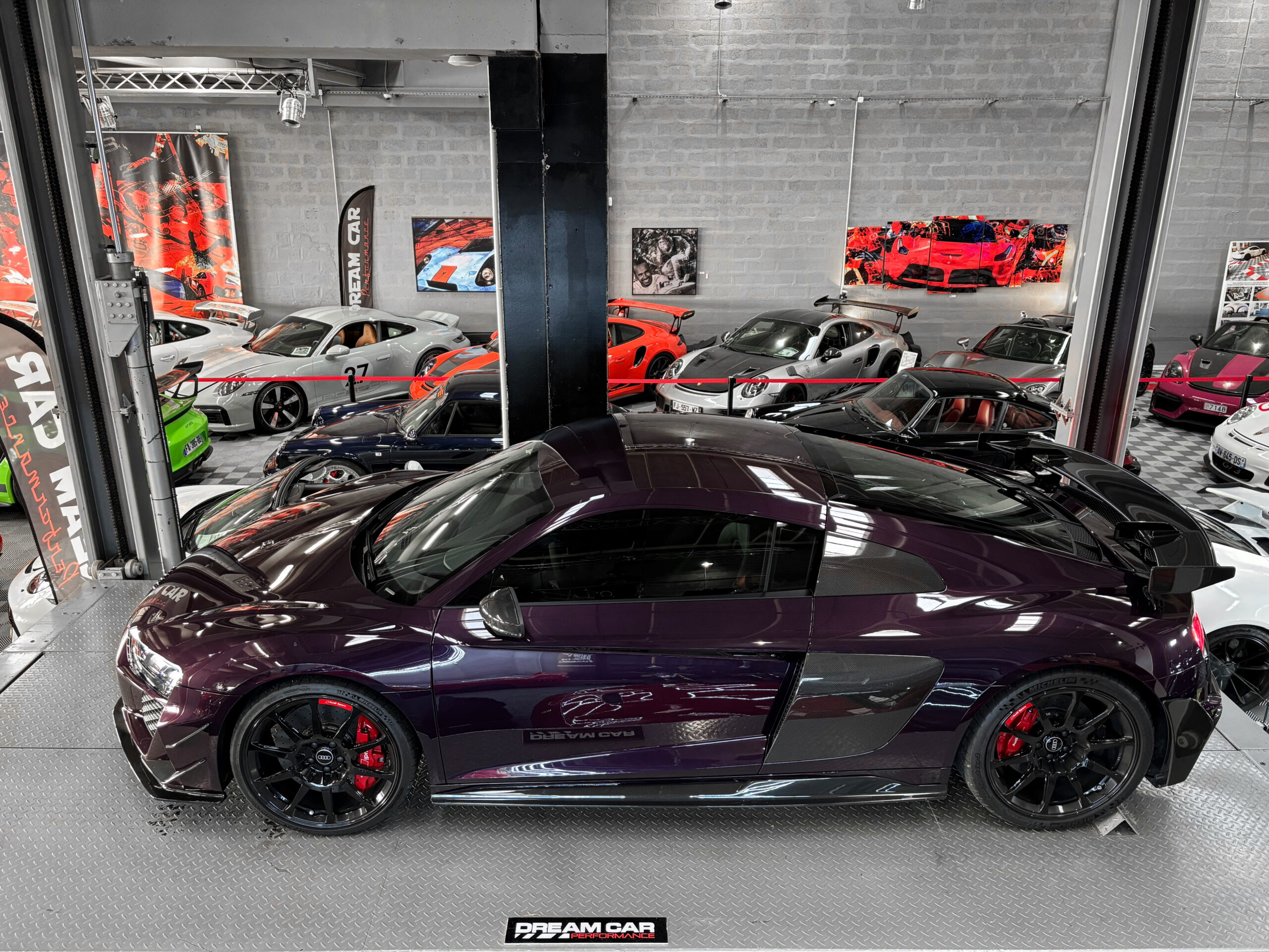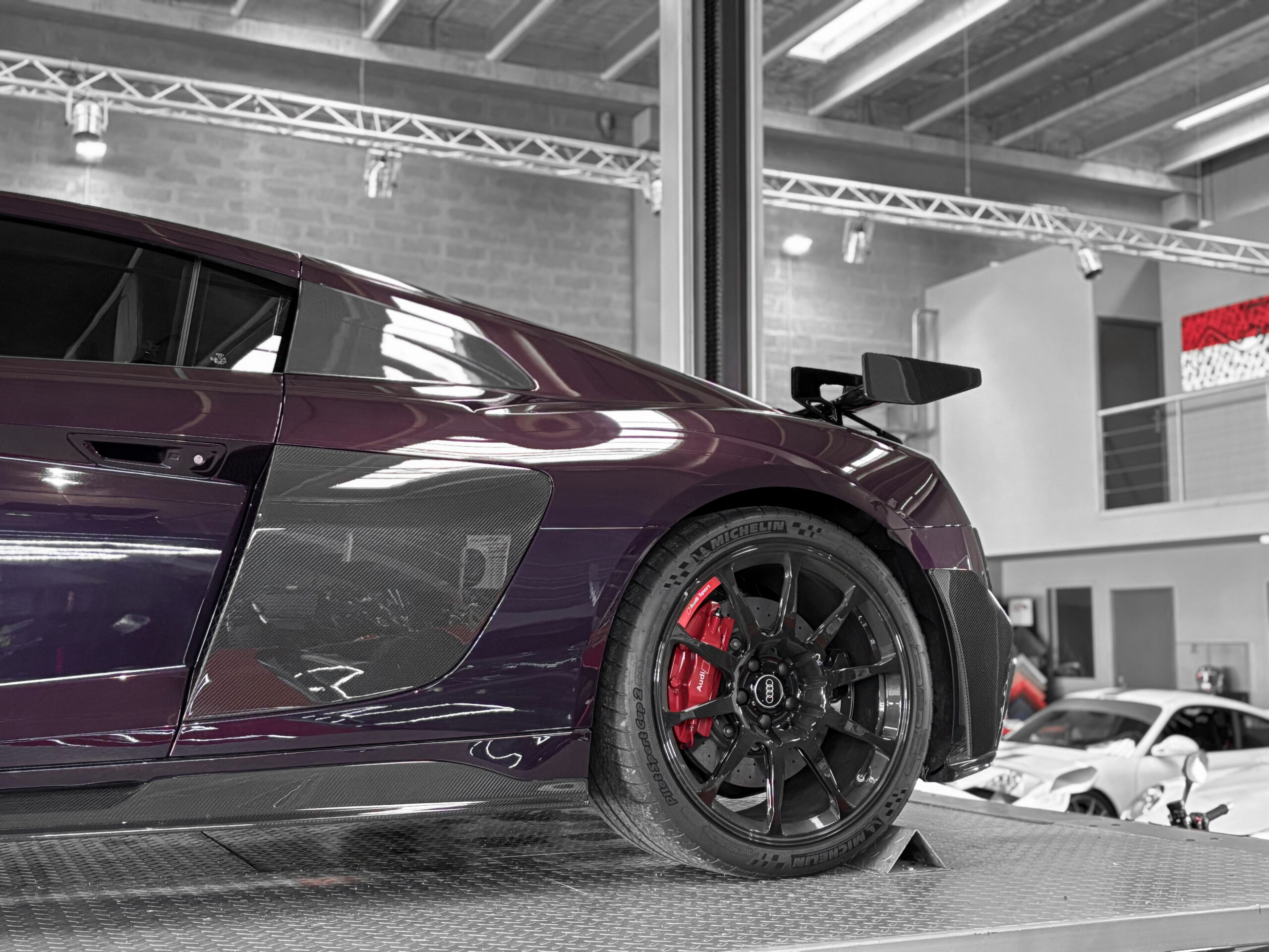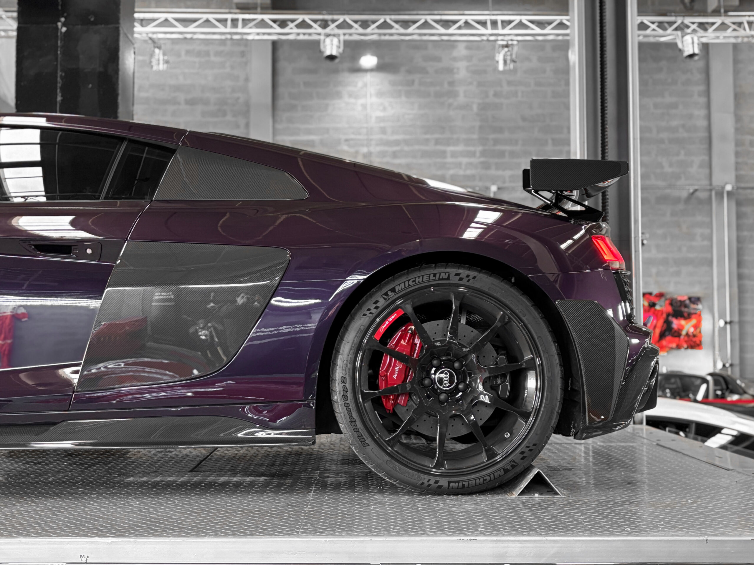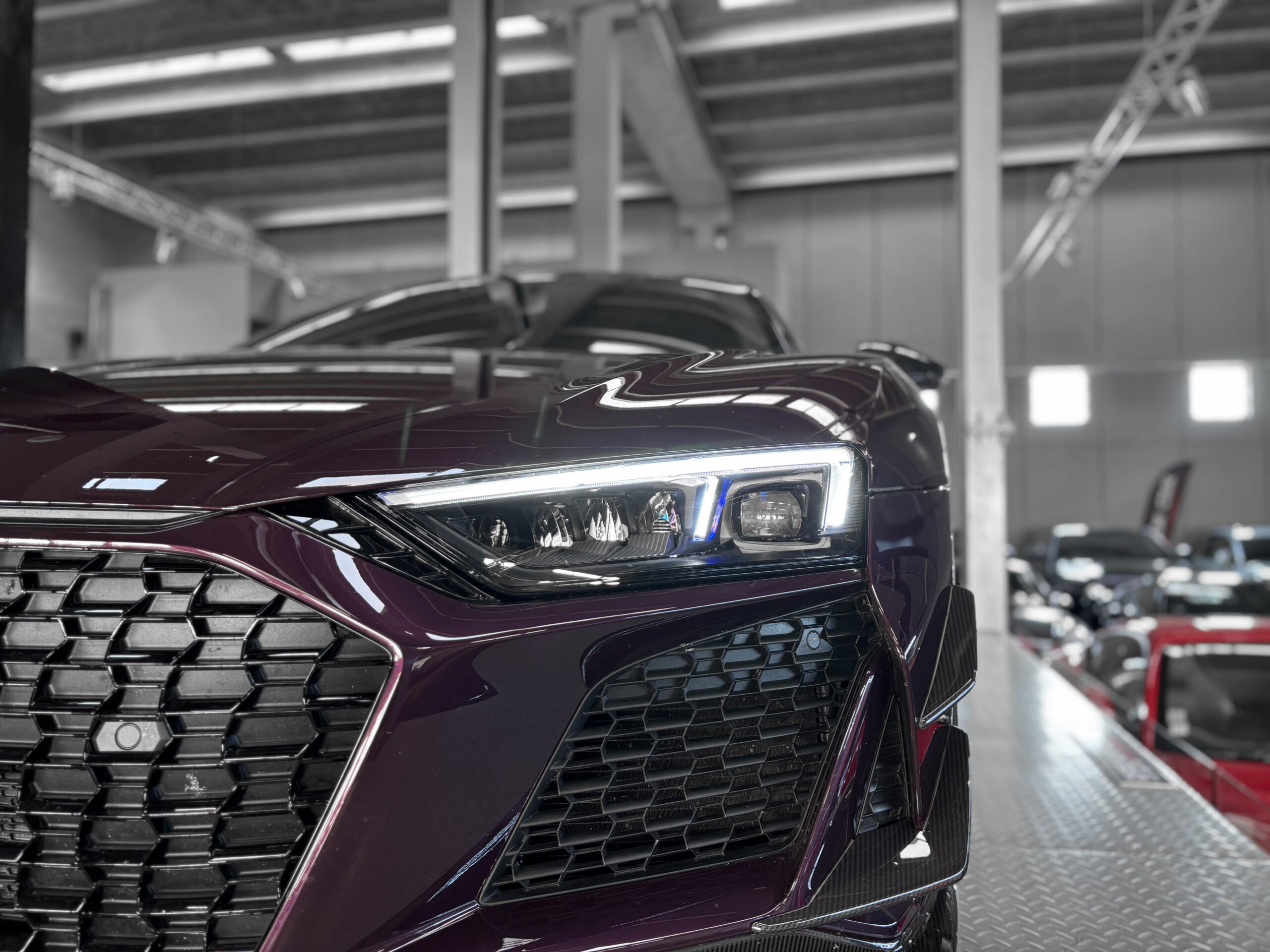Le modèle présenté ici dans une très belle configuration est un des 333 exemplaires de la dernière Audi R8 produite la GT, dans une teinte Merlin Purple en option Audi Exclusive.