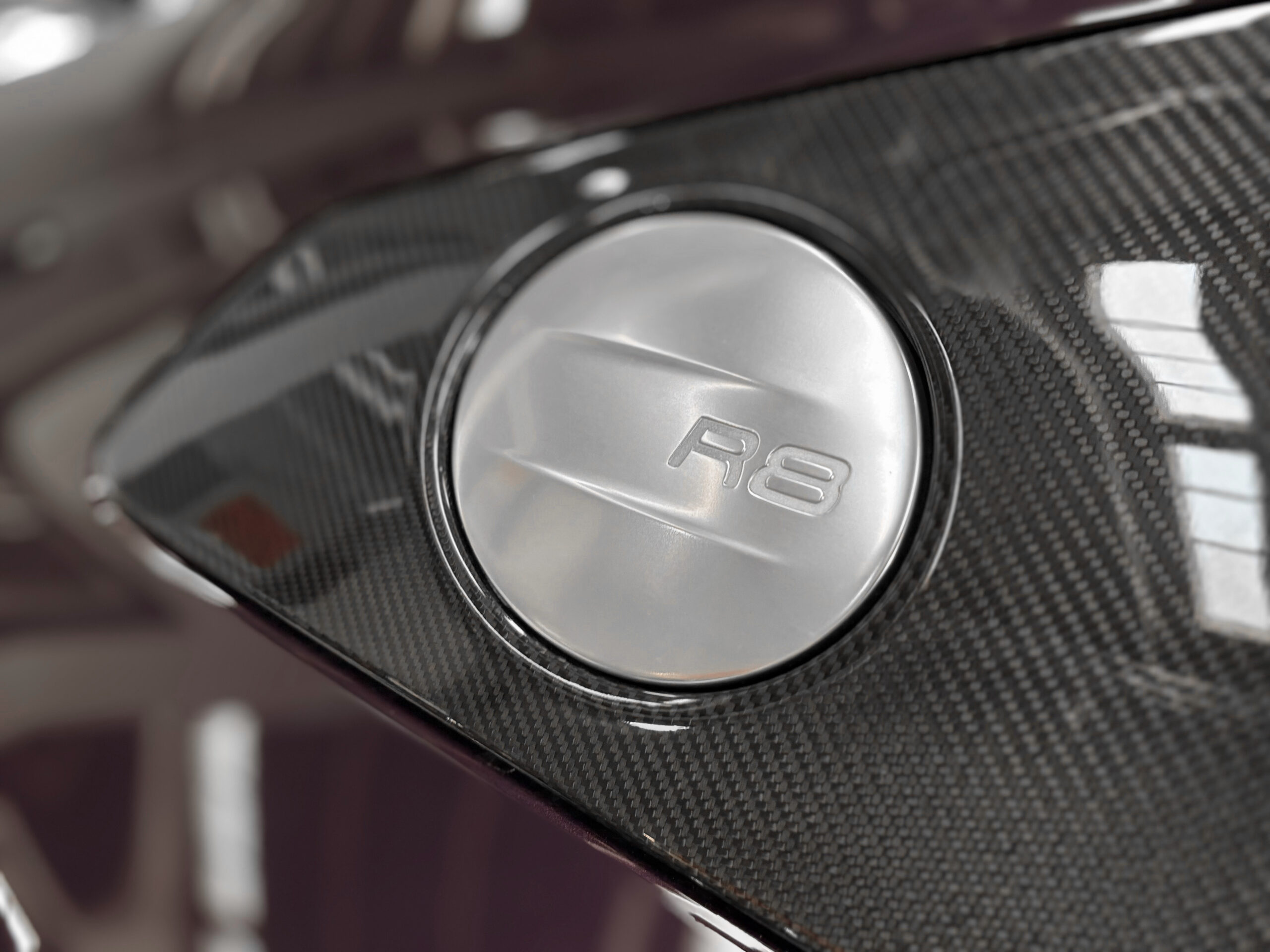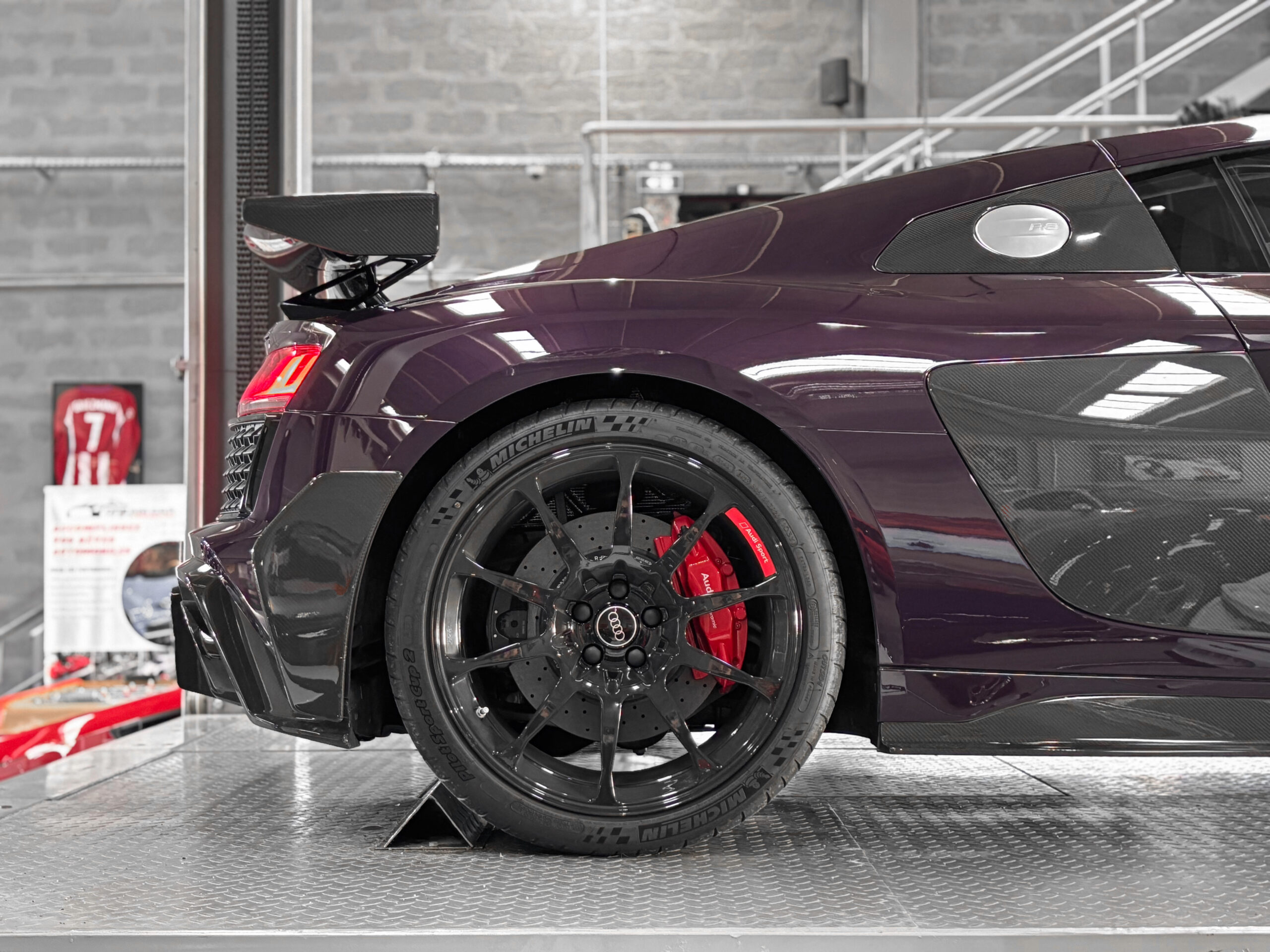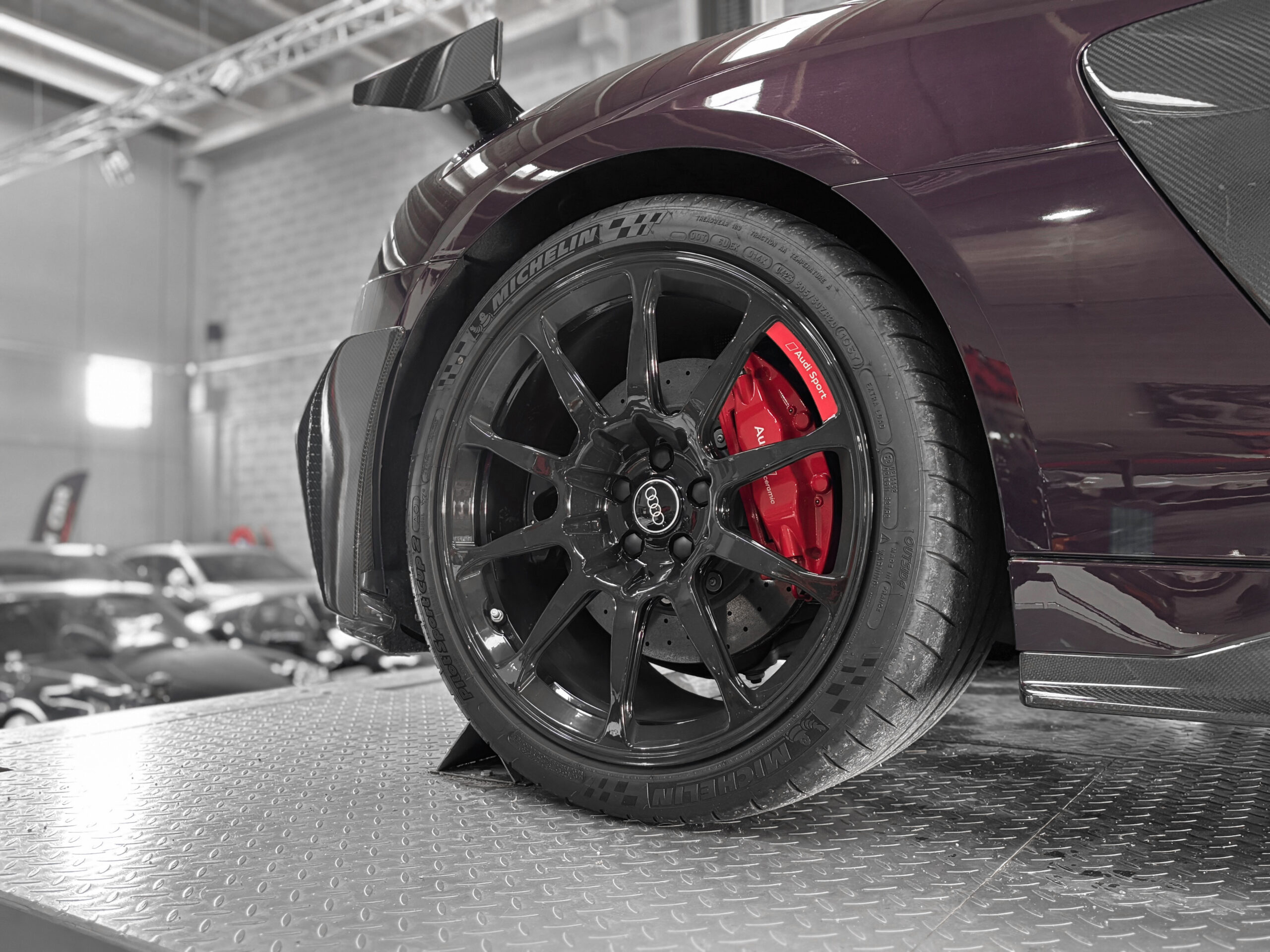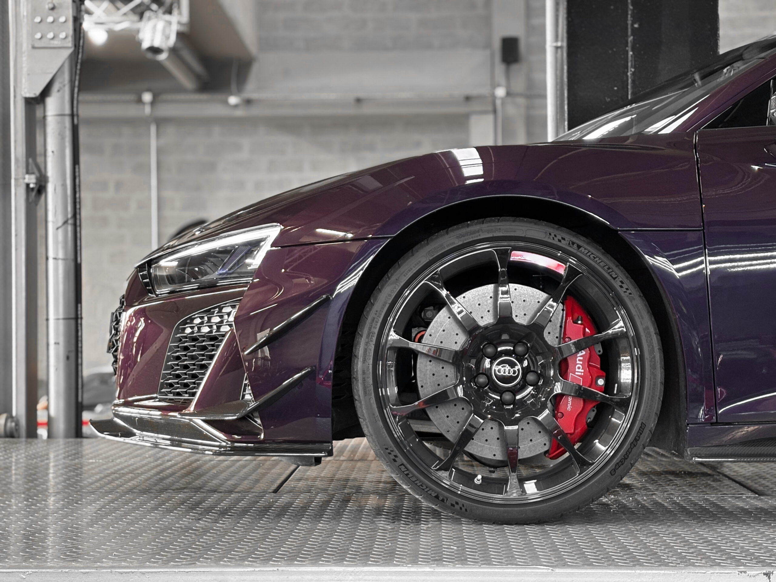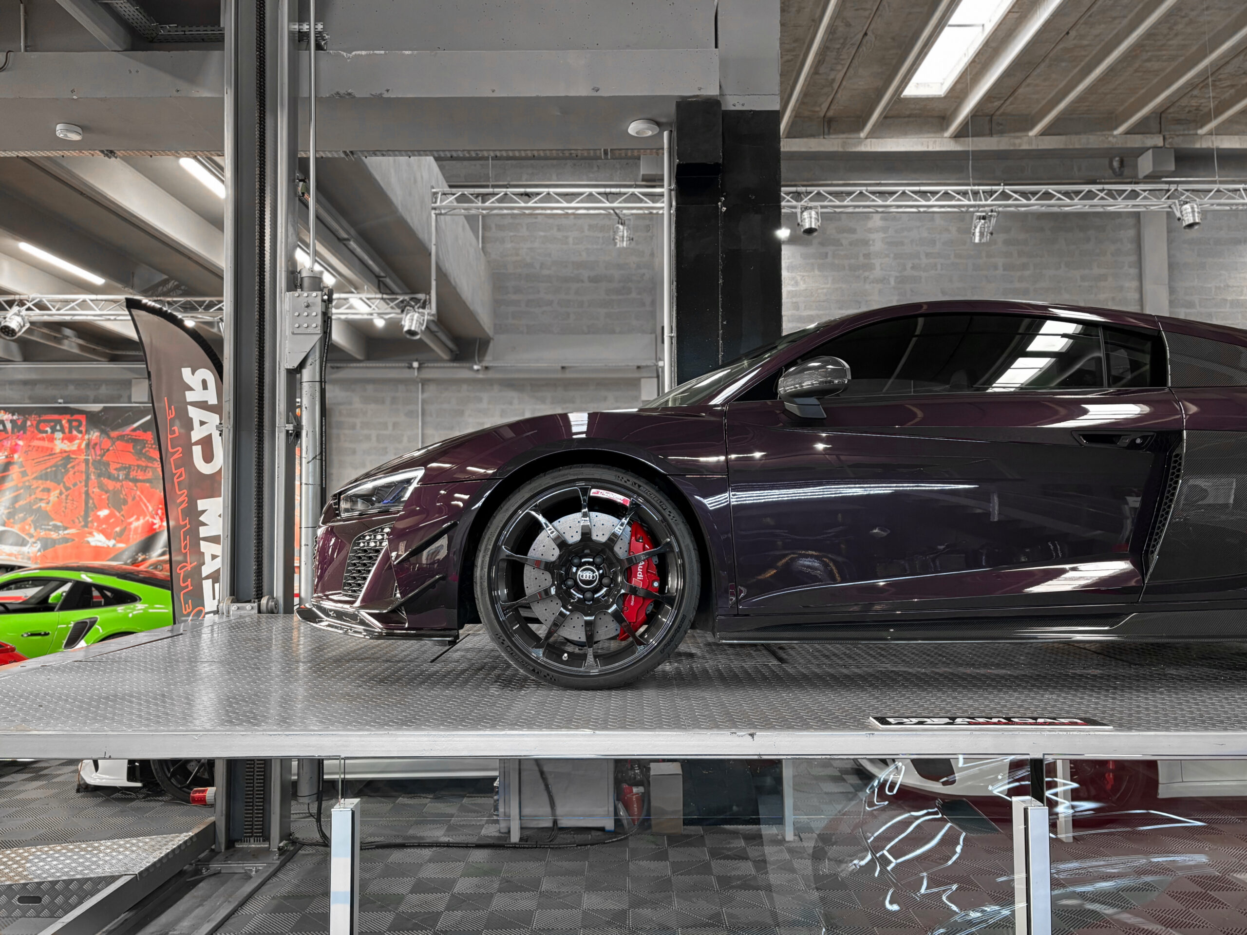 Le modèle présenté ici dans une très belle configuration est un des 333 exemplaires de la dernière Audi R8 produite la GT, dans une teinte Merlin Purple en option Audi Exclusive.