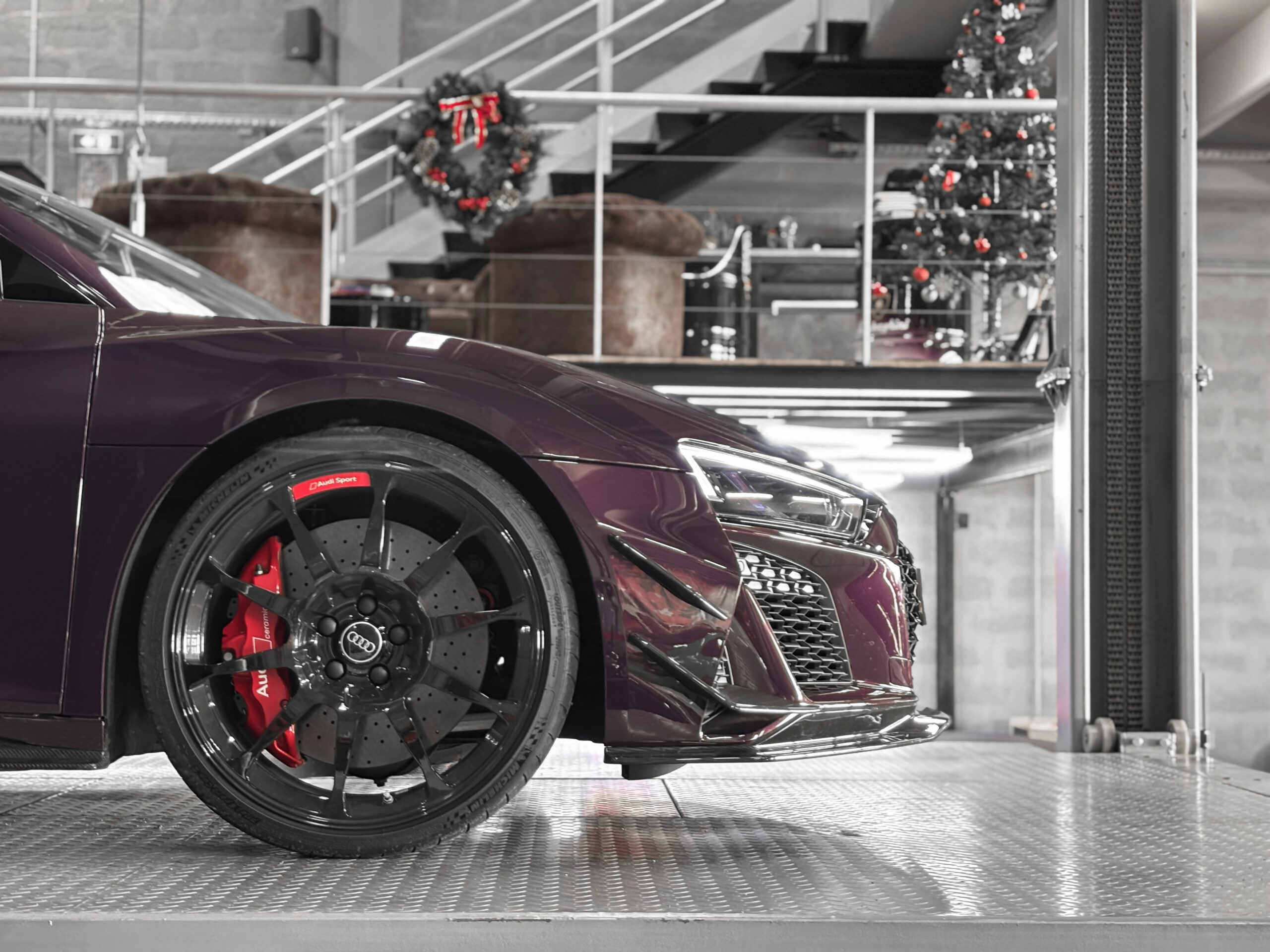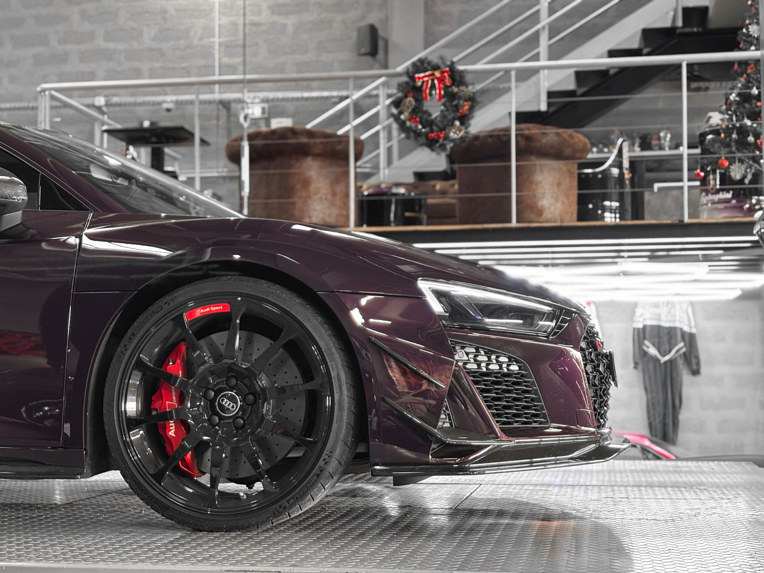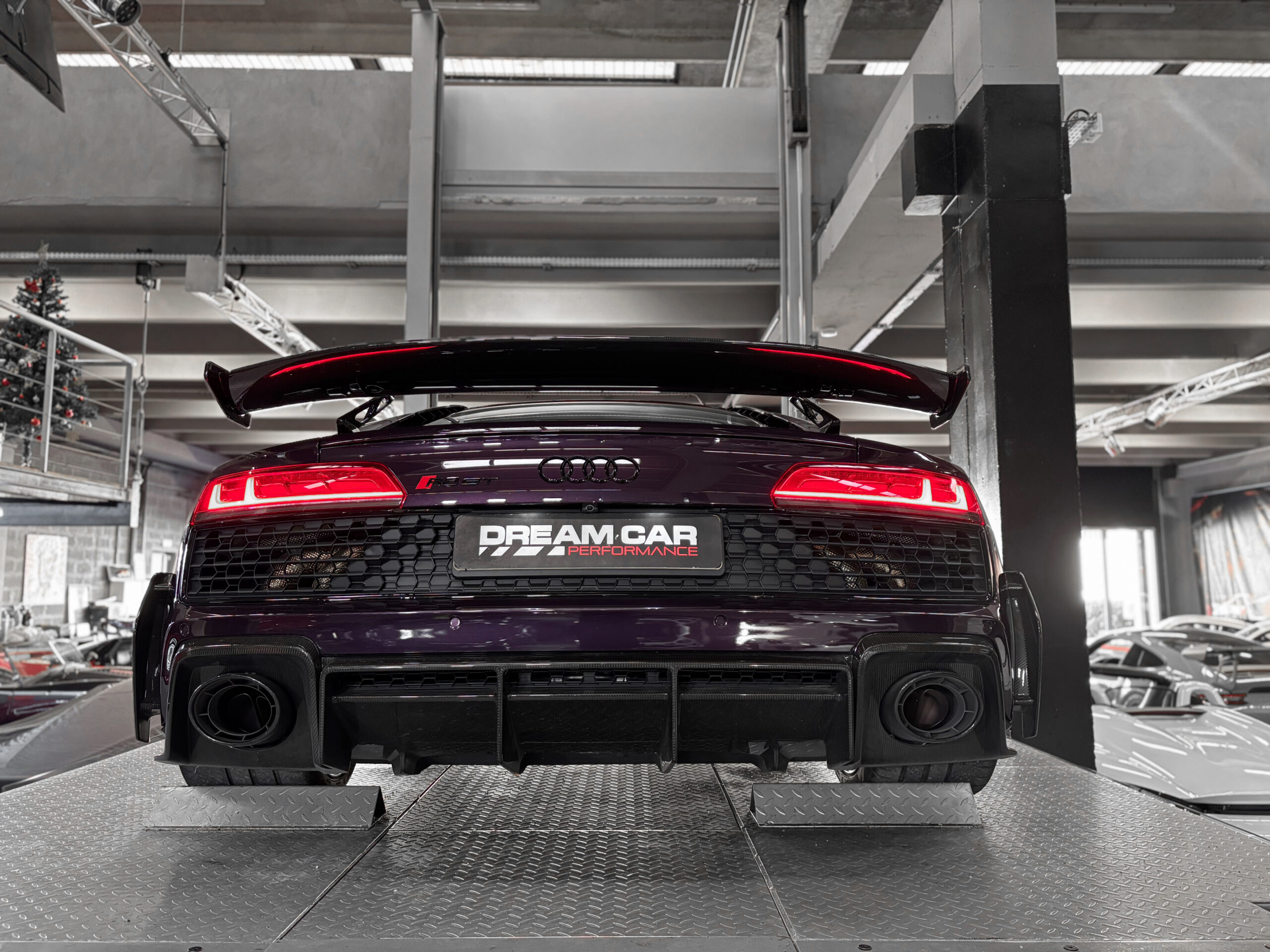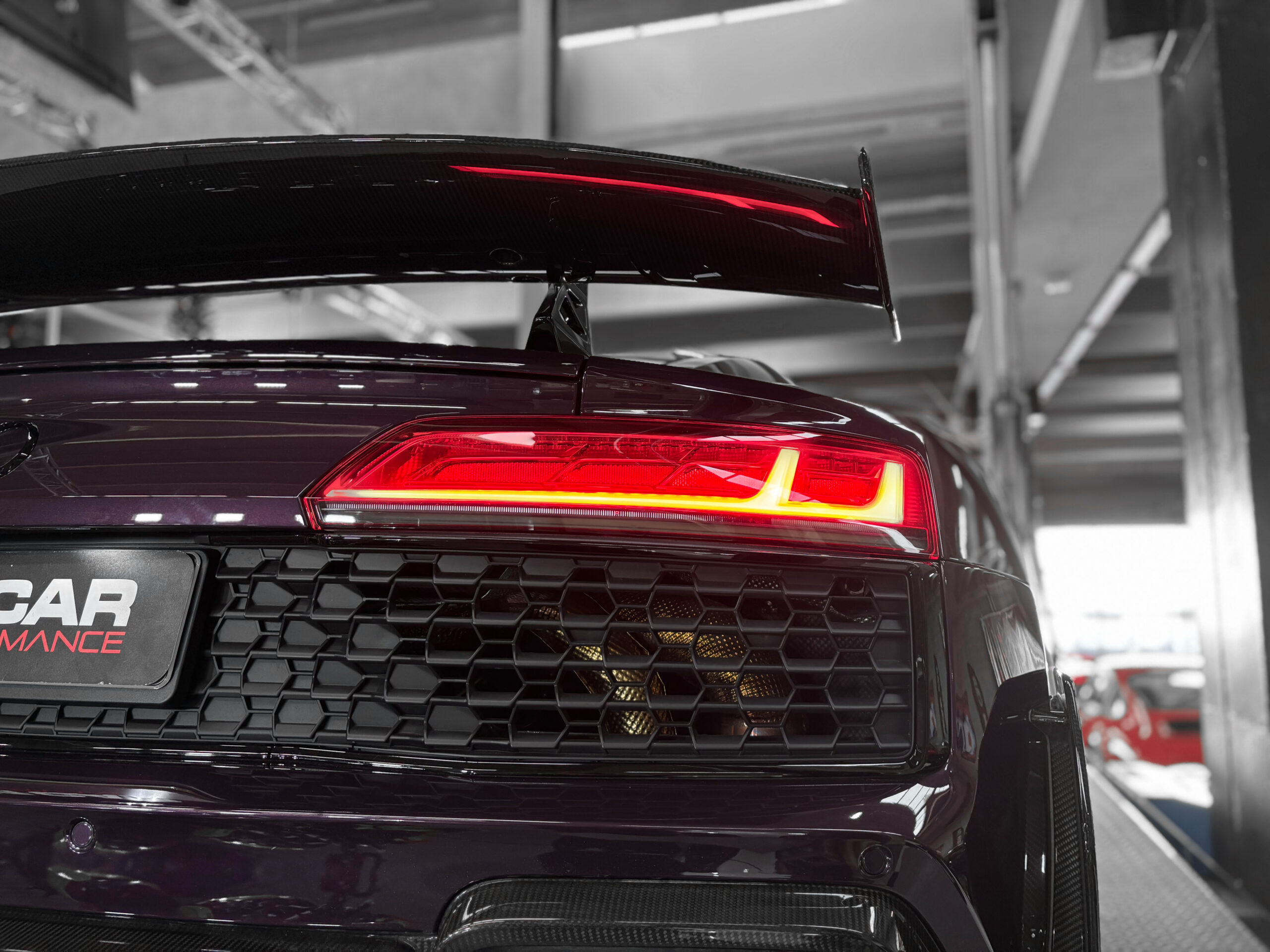 Le modèle présenté ici dans une très belle configuration est un des 333 exemplaires de la dernière Audi R8 produite la GT, dans une teinte Merlin Purple en option Audi Exclusive.