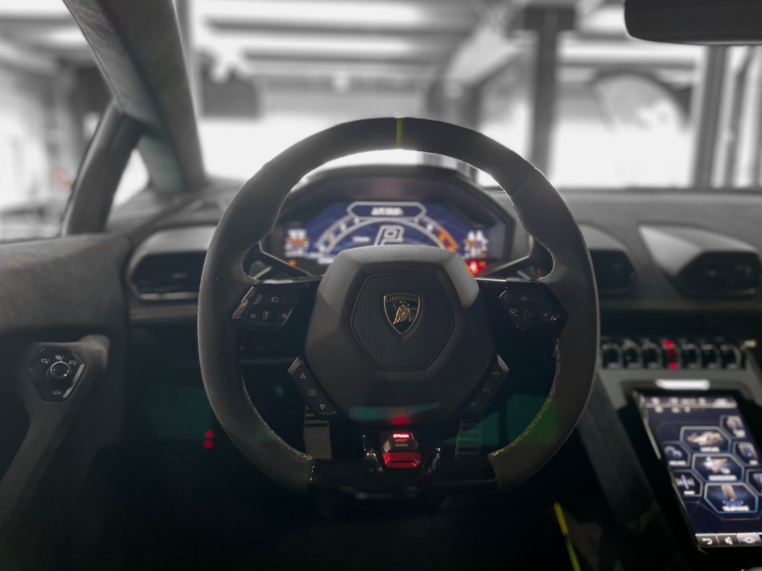 Volant en alcantara avec logo central en noir brillant et marqueur à midi verde scandale