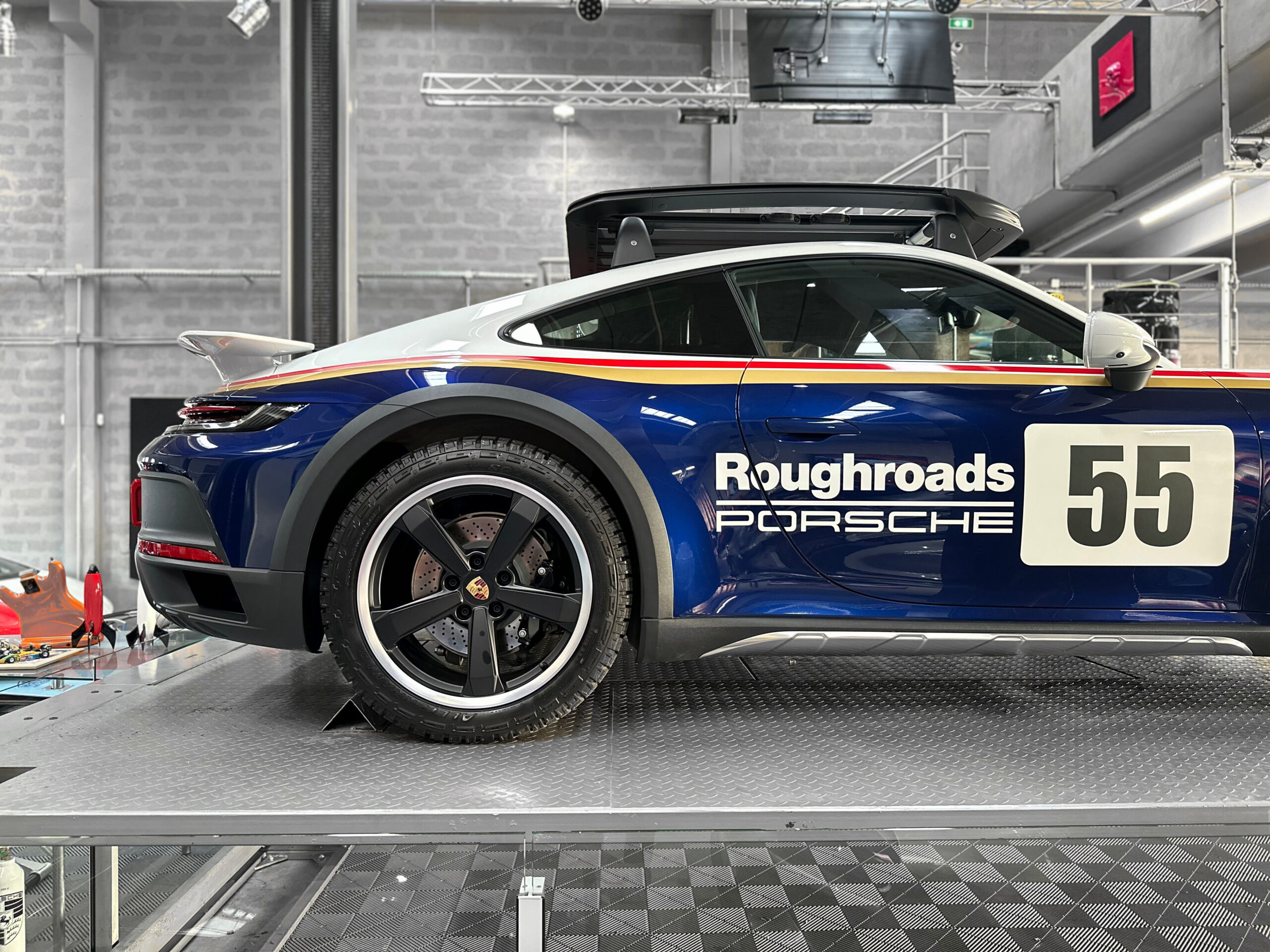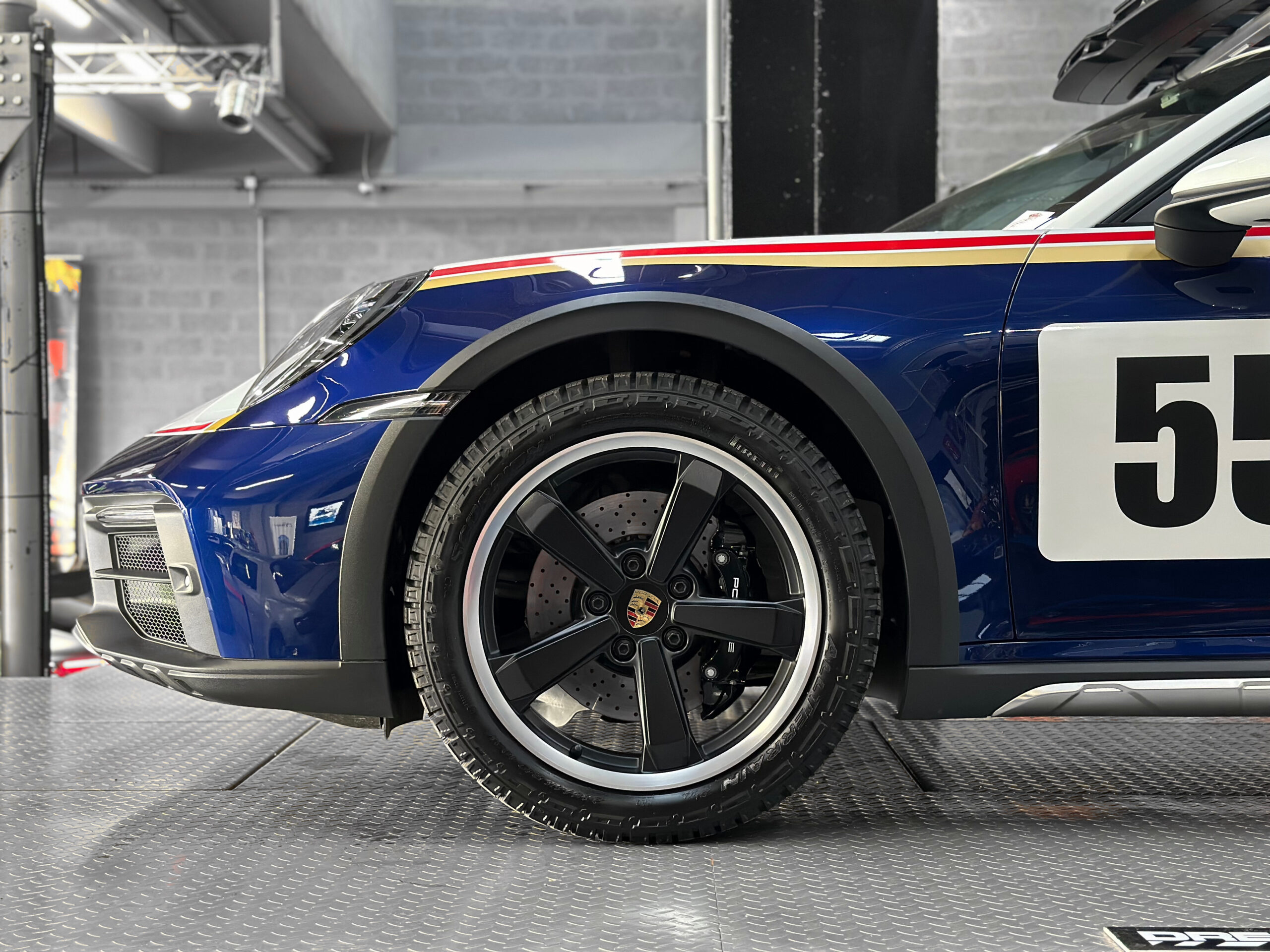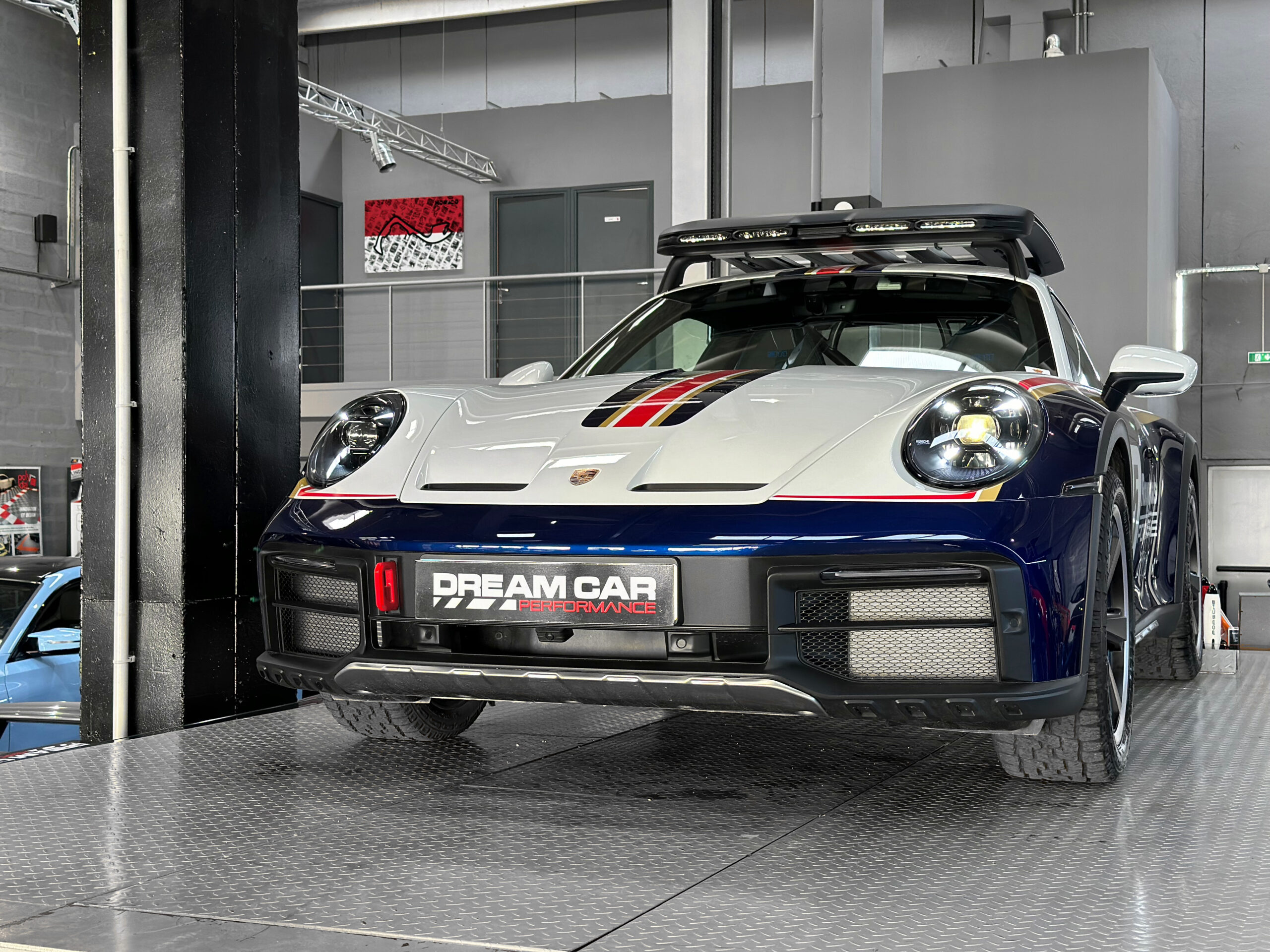 Clin d’œil à la voiture originale historique : la peinture bicolore Blanc / Bleu Gentiane métallisé agrémentée de bandes décoratives Or / Rouge ainsi que les jantes 19/20 pouces peintes en noir équipées de pneus tout-terrain, rendent hommage à la mythique Porsche 953 de 1984.