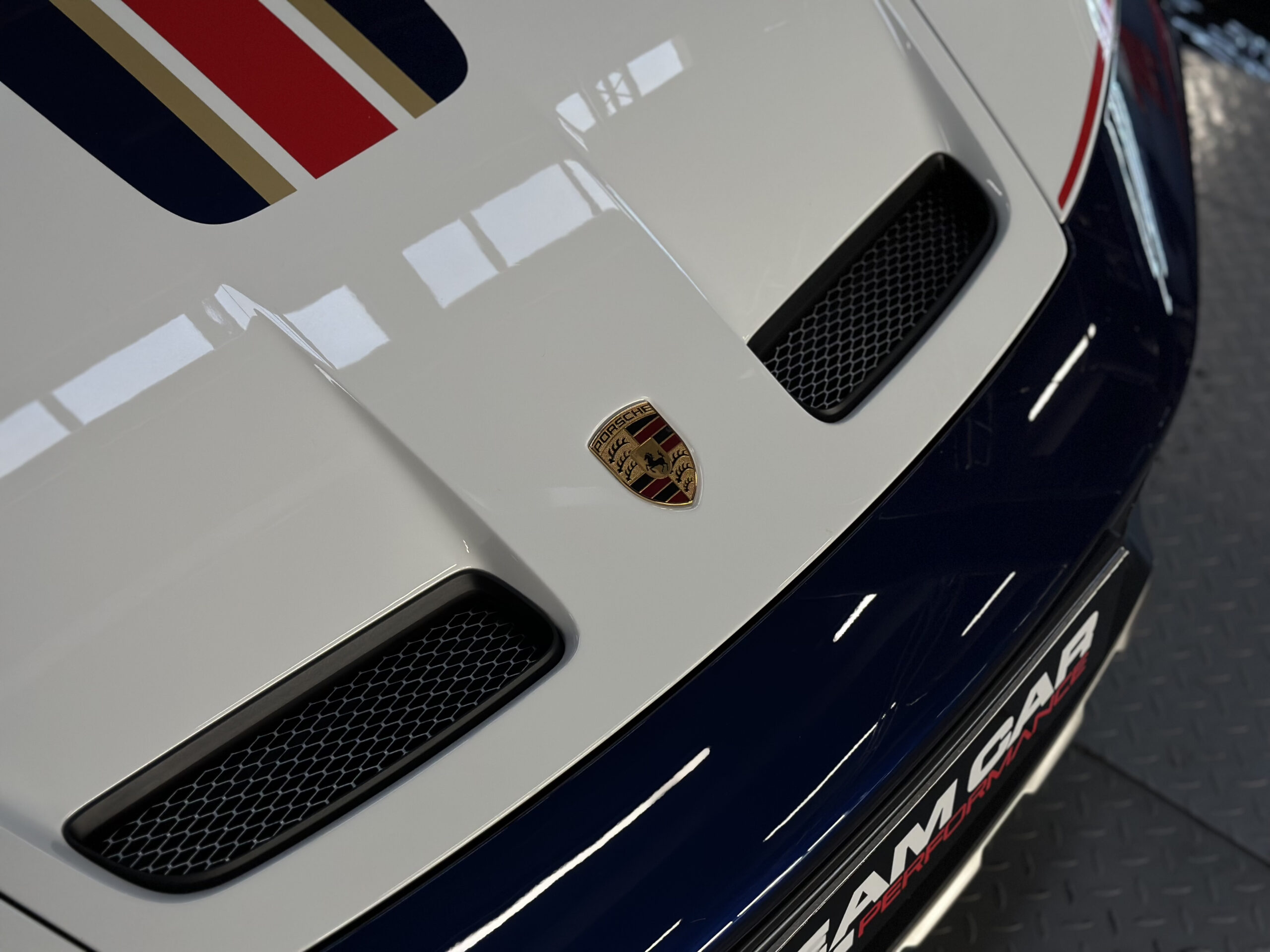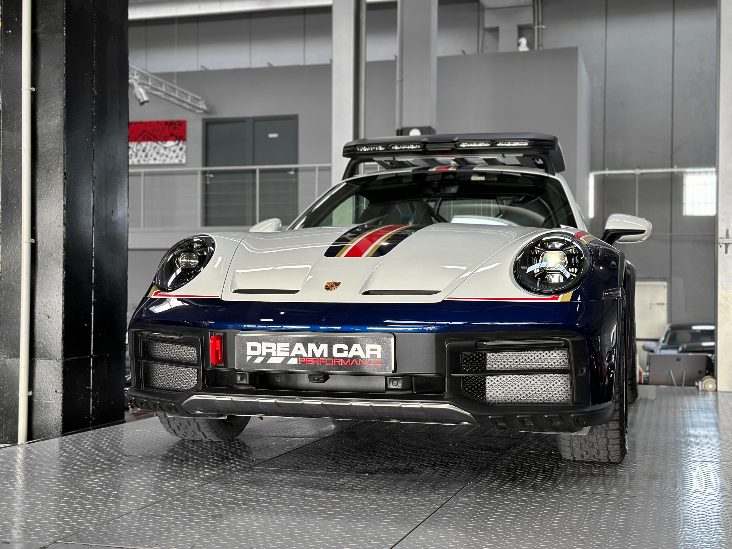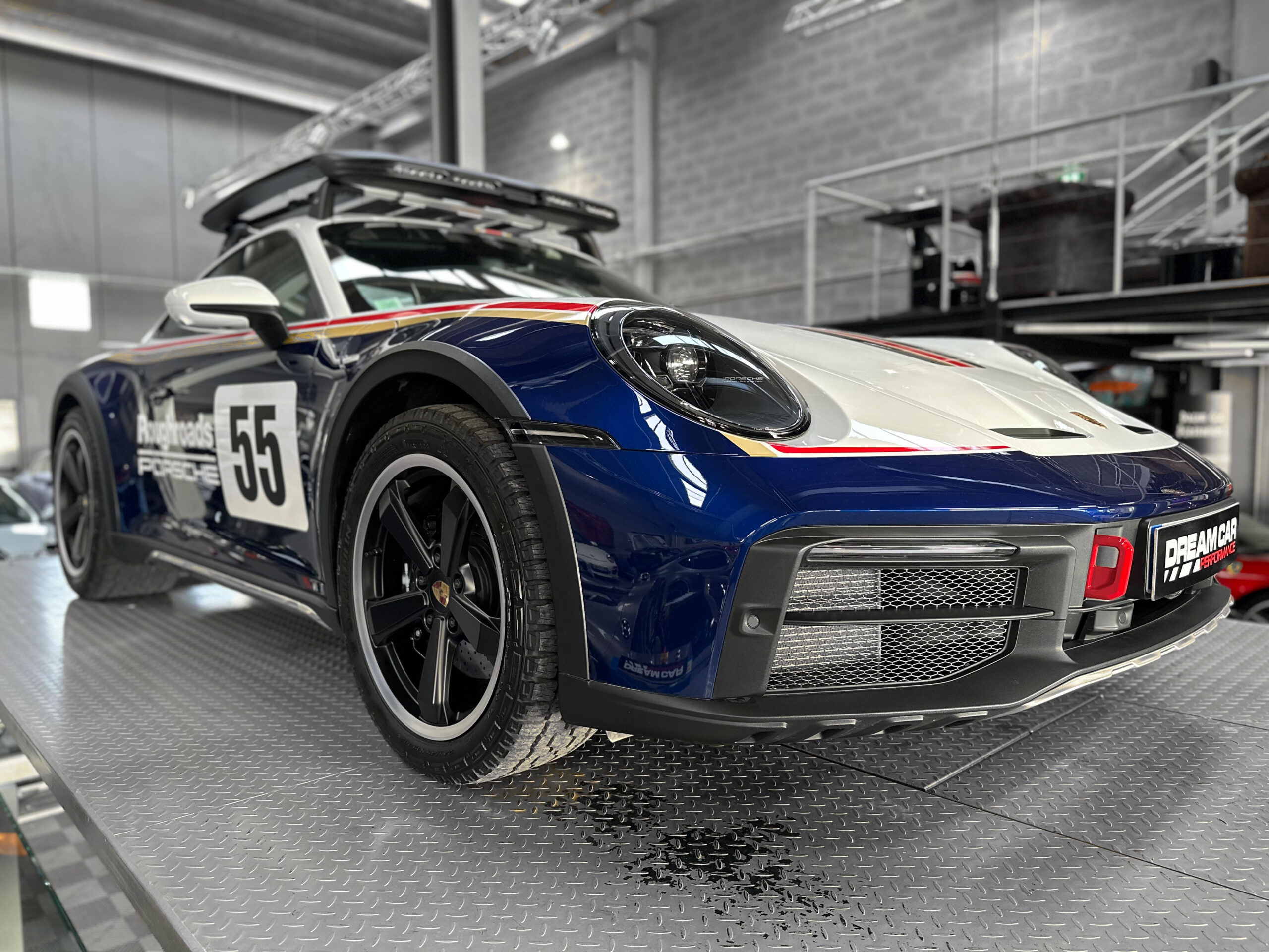 Clin d’œil à la voiture originale historique : la peinture bicolore Blanc / Bleu Gentiane métallisé agrémentée de bandes décoratives Or / Rouge ainsi que les jantes 19/20 pouces peintes en noir équipées de pneus tout-terrain, rendent hommage à la mythique Porsche 953 de 1984.