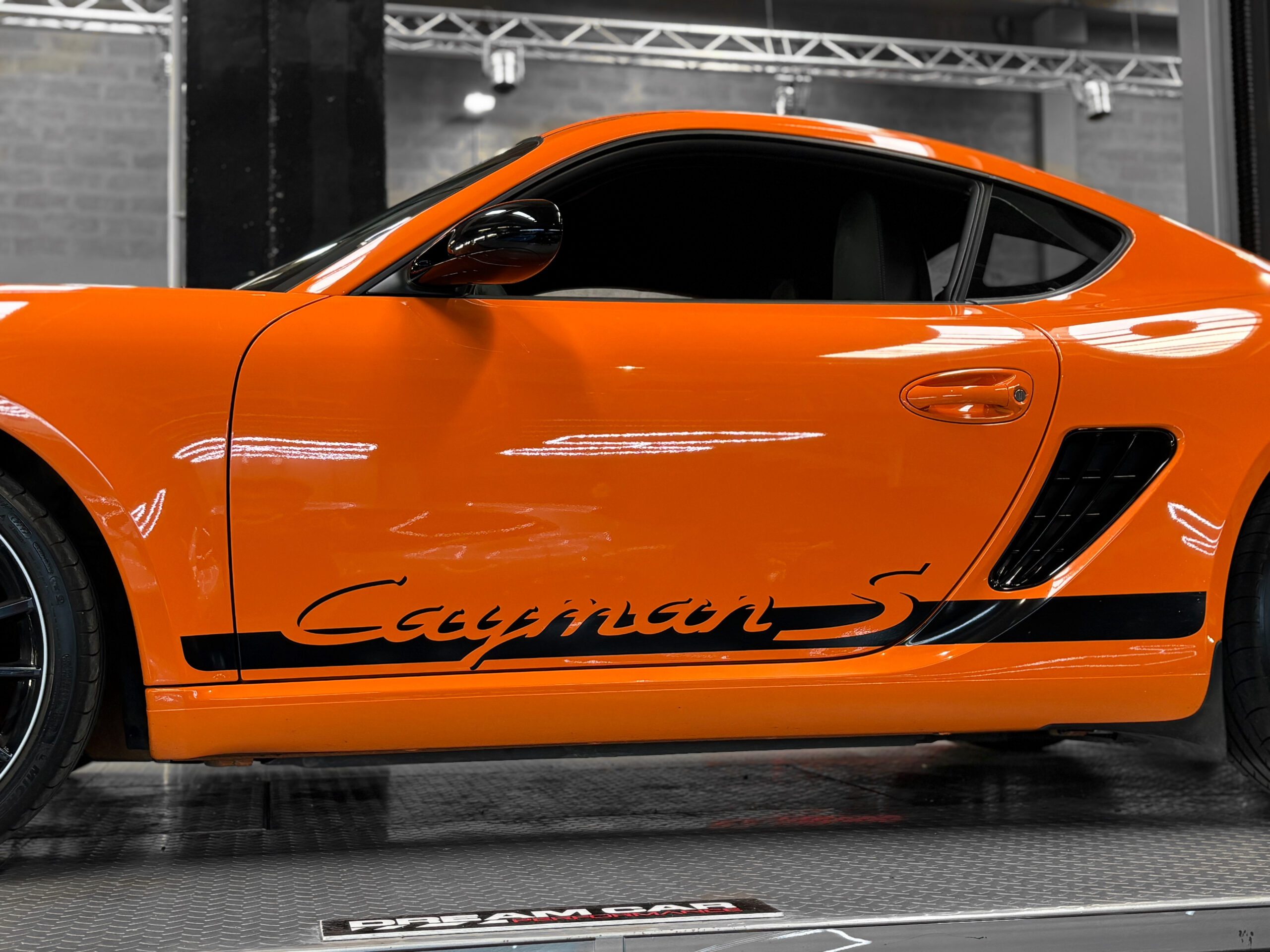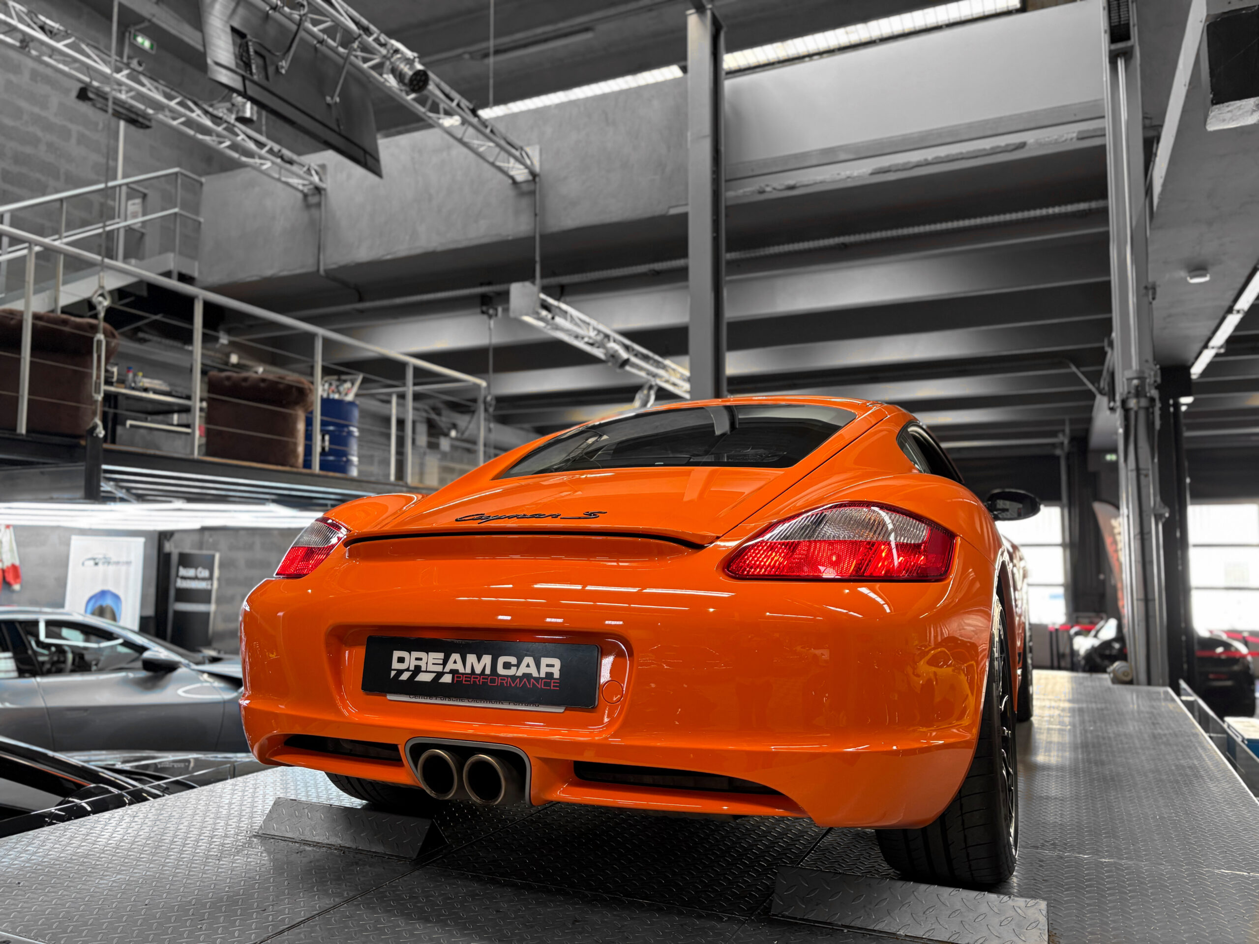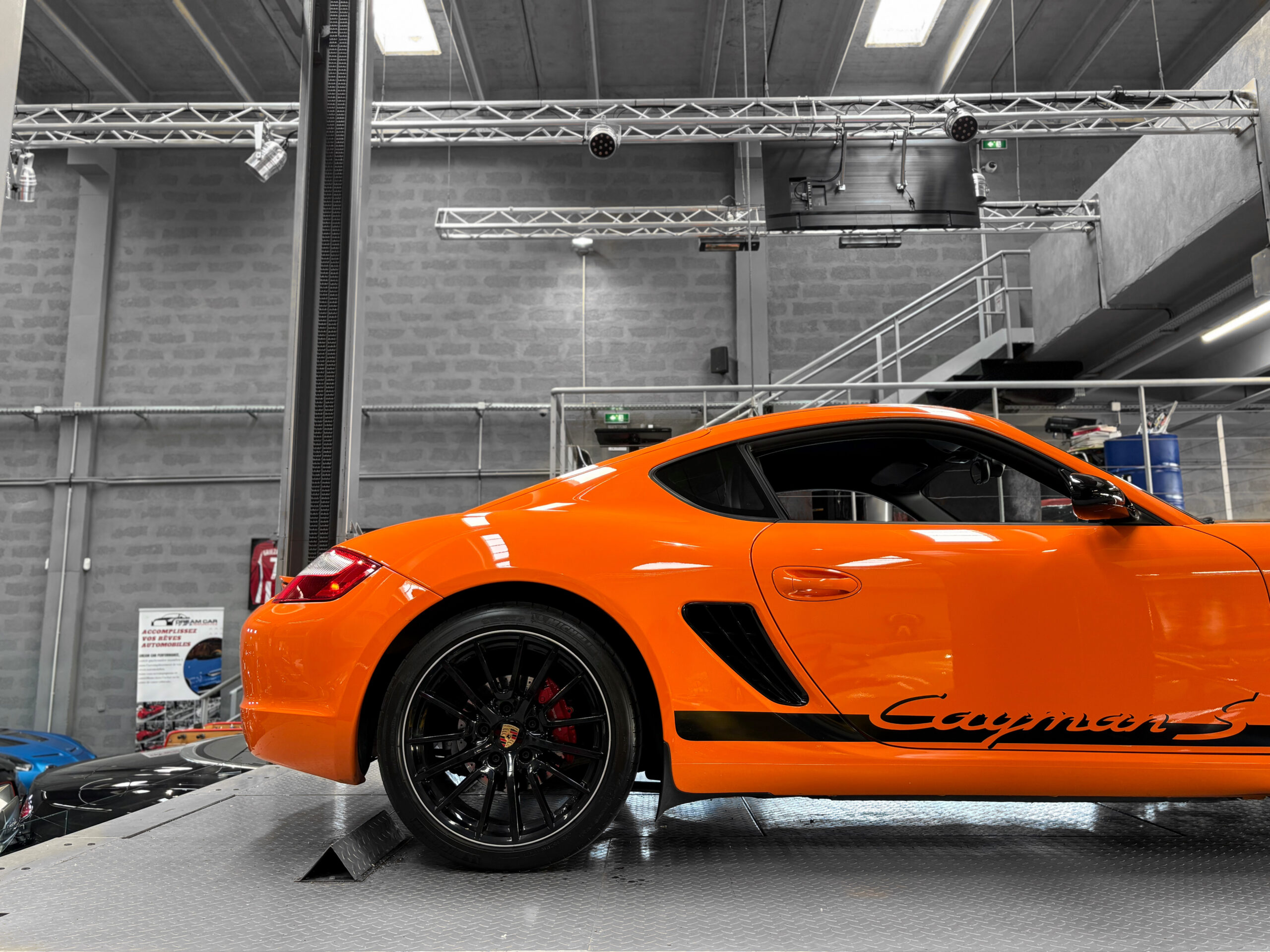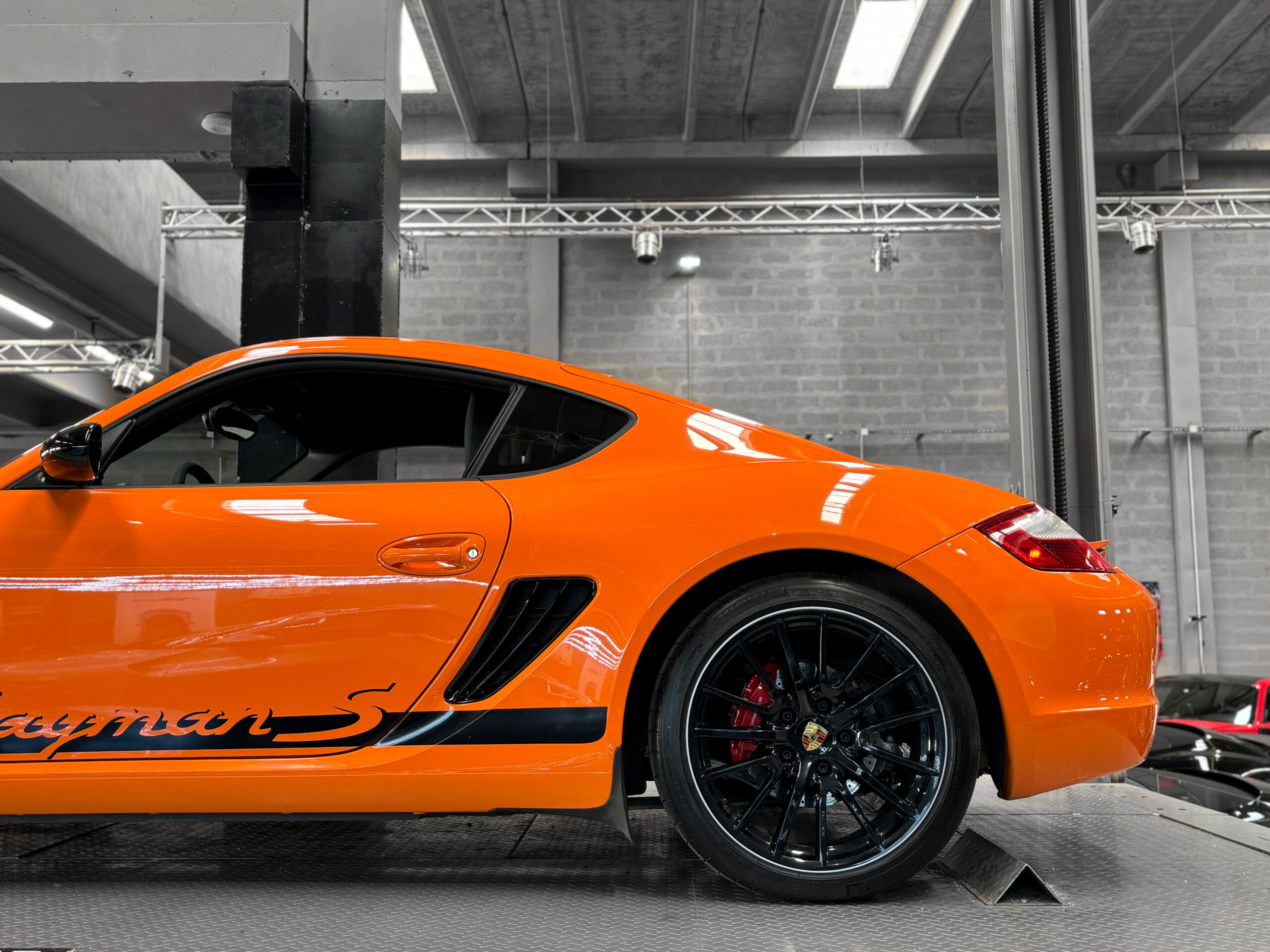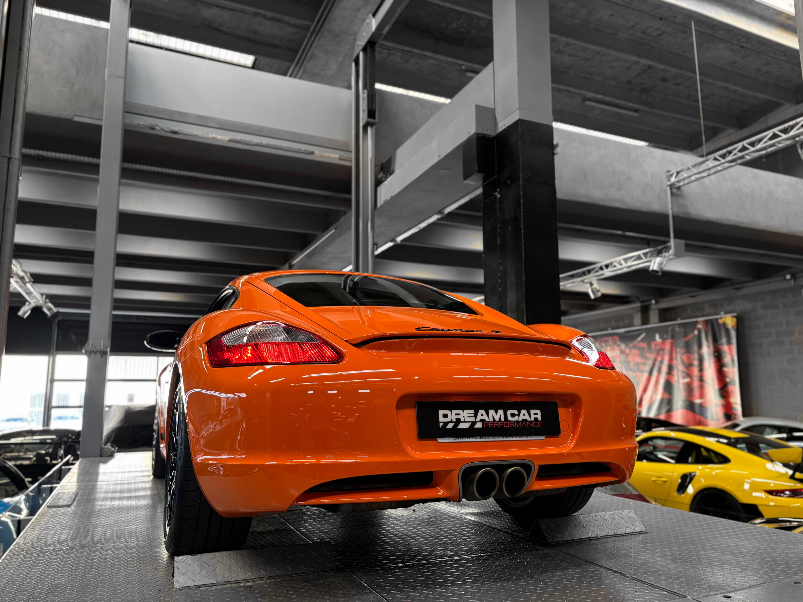 La Cayman 987 S Sport Edition se distingue par son Orange vif, ses jantes noires 19”, ses bandes “Cayman S” sur les flancs et son échappement sport.