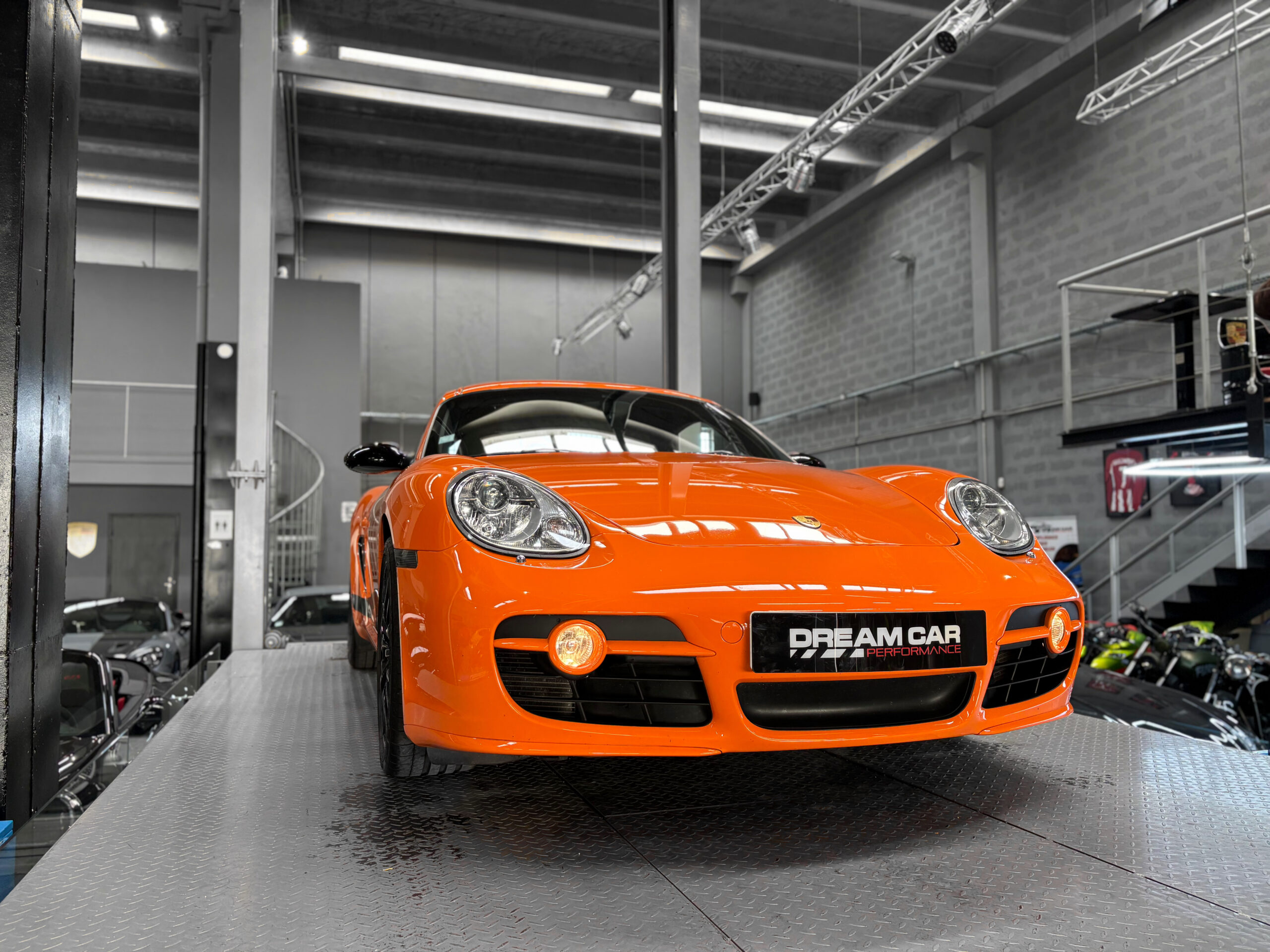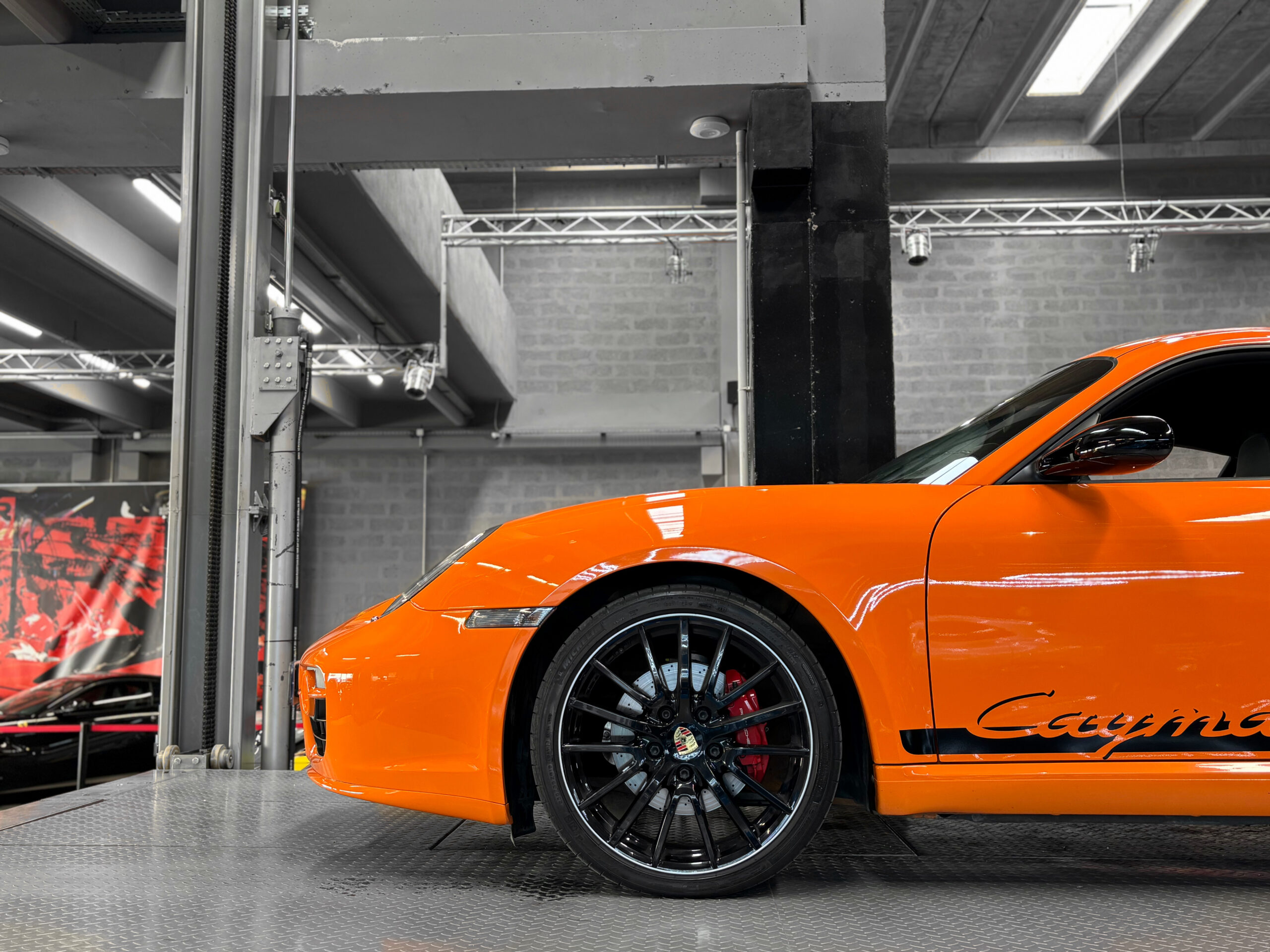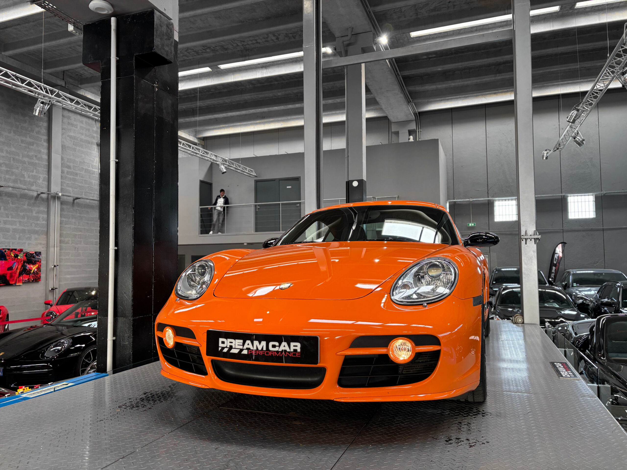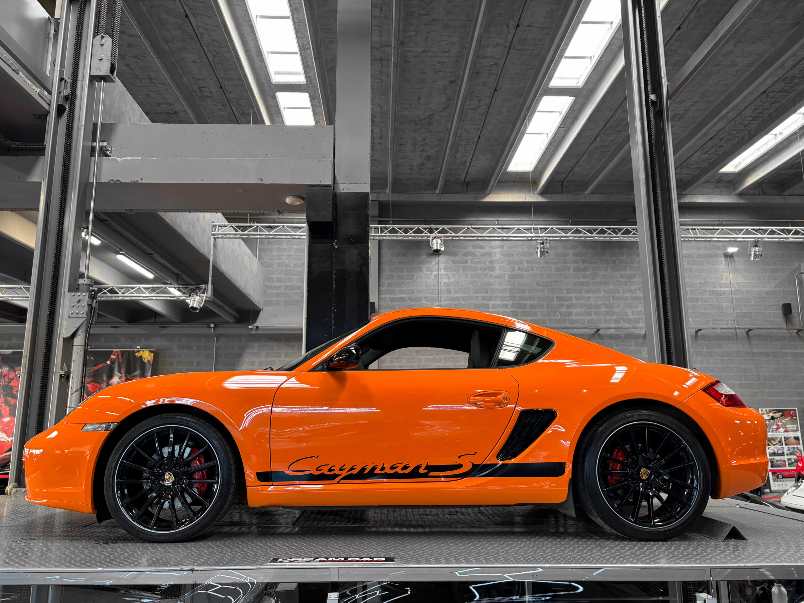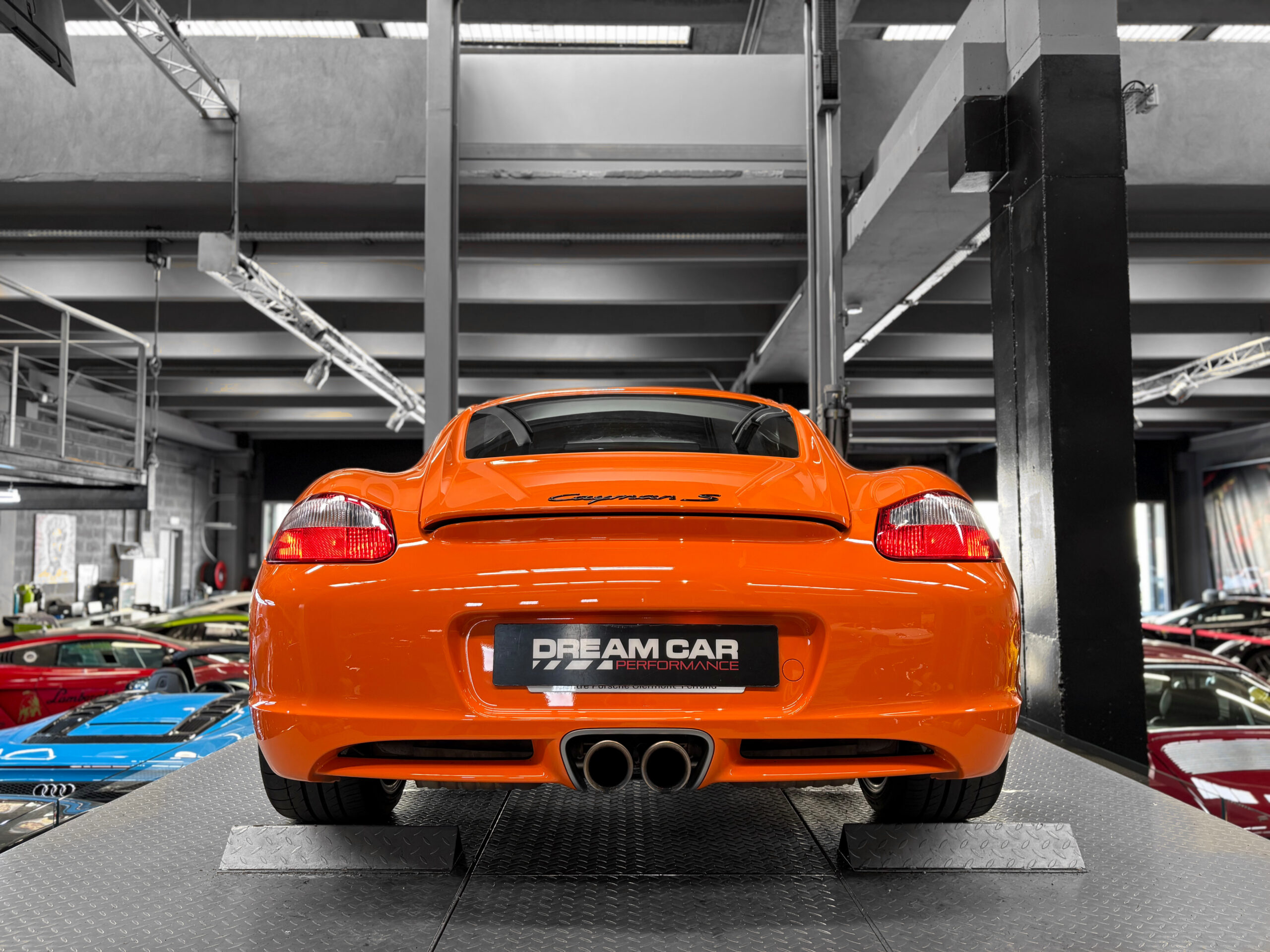 La Cayman 987 S Sport Edition se distingue par son Orange vif, ses jantes noires 19”, ses bandes “Cayman S” sur les flancs et son échappement sport.